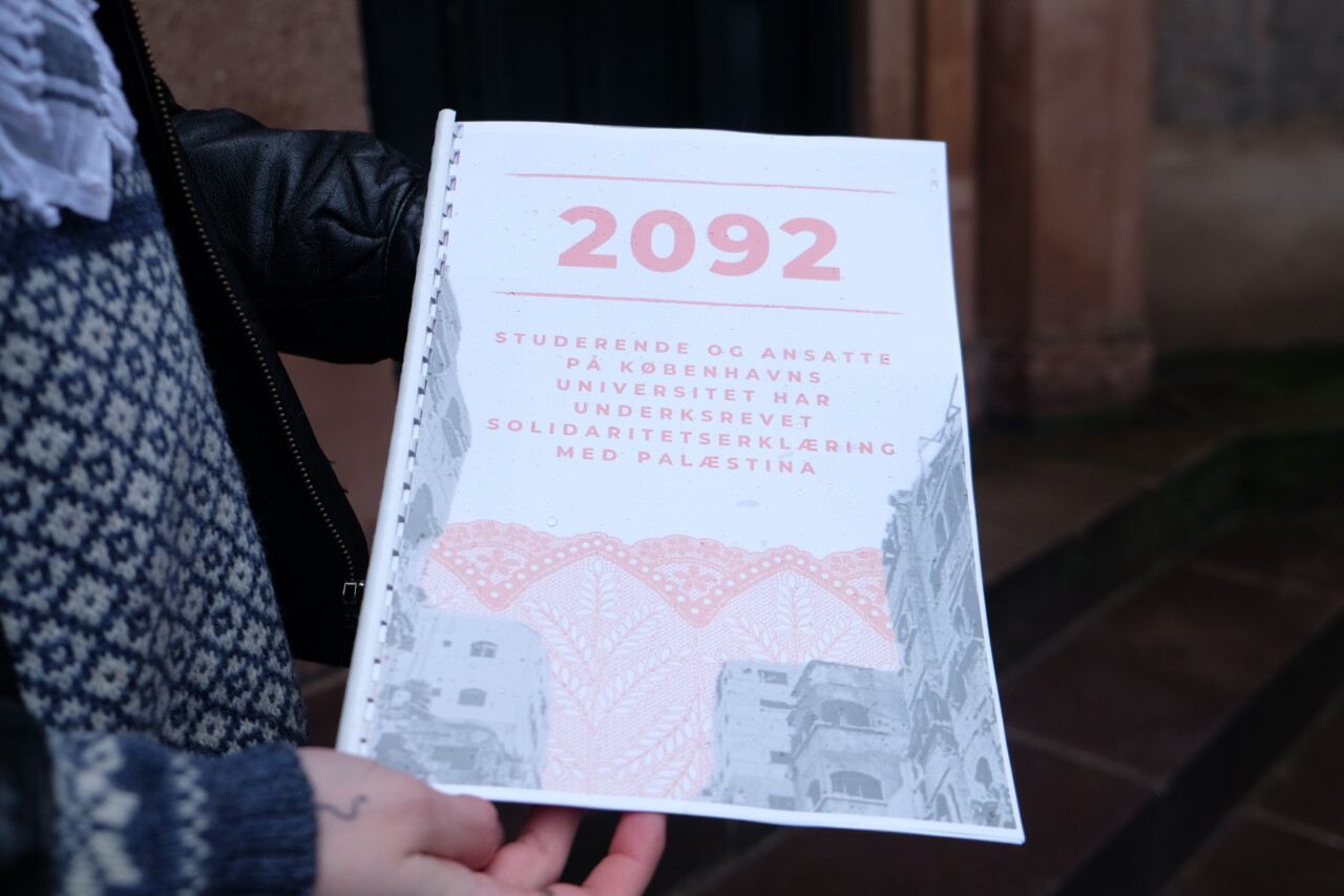 Onsdag den 24. januar stod Rebecca Knirke, der er aktiv i Studerende mod Besættelsen, nemlig klar i Lindegården, hvor universitetsbestyrelsen holdt møde. Med sig havde hun 2.092 dugfriske underskrifter fra studerende og ansatte, der har tre specifikke krav til universitetsledelsen.
