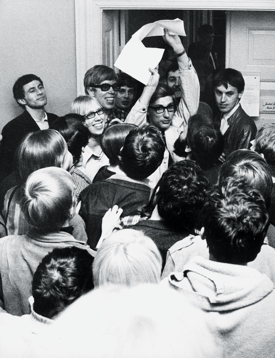 TRIUMF - 19. april 1968 besætter studerende Psykologisk Laboratorium i Studiegården. De kræver at få 50 procent af pladserne i studienævn og alle andre organer på KU. 24. april kan de studerendes forhandler, Erik de Place Andersen, triumferende fremvise en aftale, han har indgået med rektor, som opfylder kravet om repræsentation i studienævnet på Psykologi.