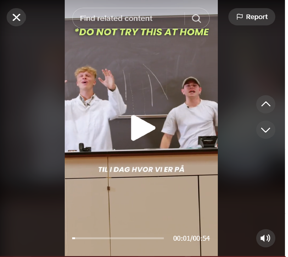 Makkerparret i videoen hedder Malthe Steffen og Jeppe Jaguar. De er influenter med en etableret følgeskare på sociale medier på lidt over 56.000. De læser ikke på nanoscience eller noget andet studie på Københavns Universitet, men de optræder som levende reklamesøjler for uddannelsen på TikTok, hvor formålet er at tiltrække nye studerende.