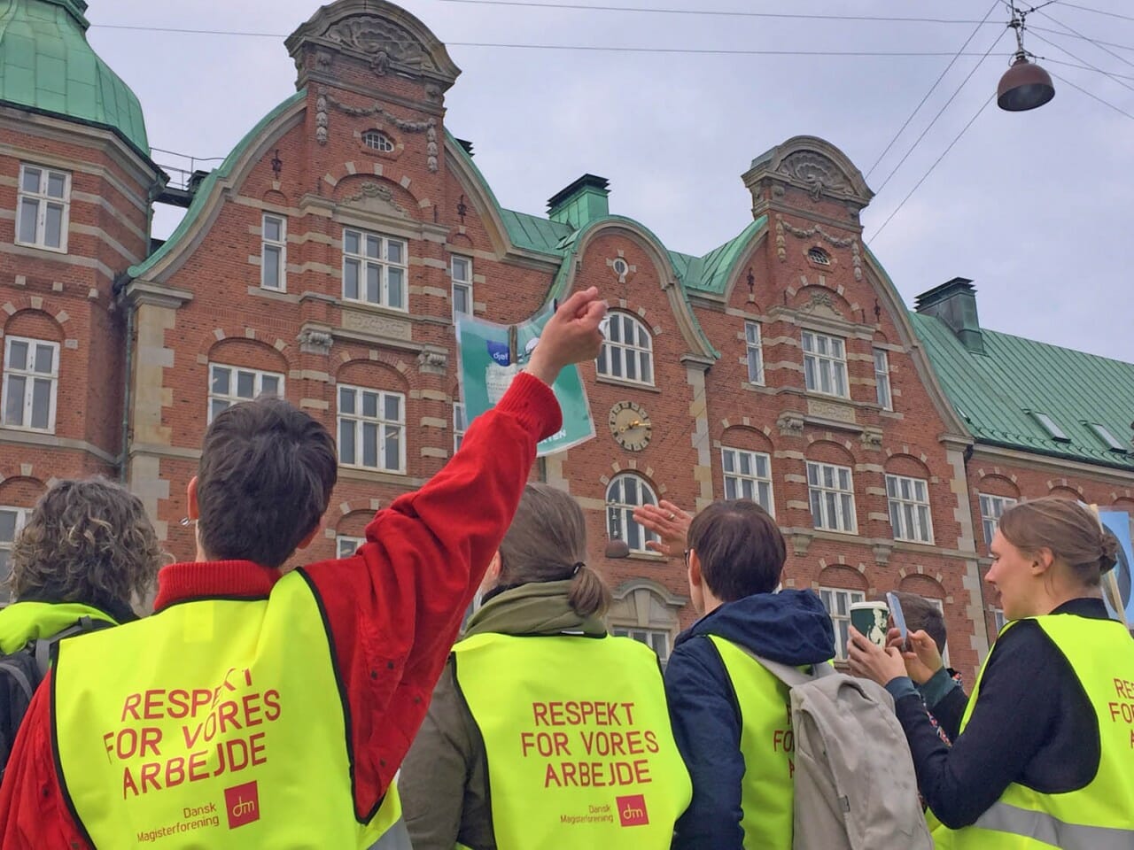 Den ligner de andre grupper. Der står 40 mennesker, de fleste iklædt gule refleksveste med RESPEKT FOR VORES ARBEJDE og et logo for Dansk Magisterforening trykt på ryggen. De jubler, når en forbikørende cyklist ringer med klokken eller en bilist trykker hornet i bund.