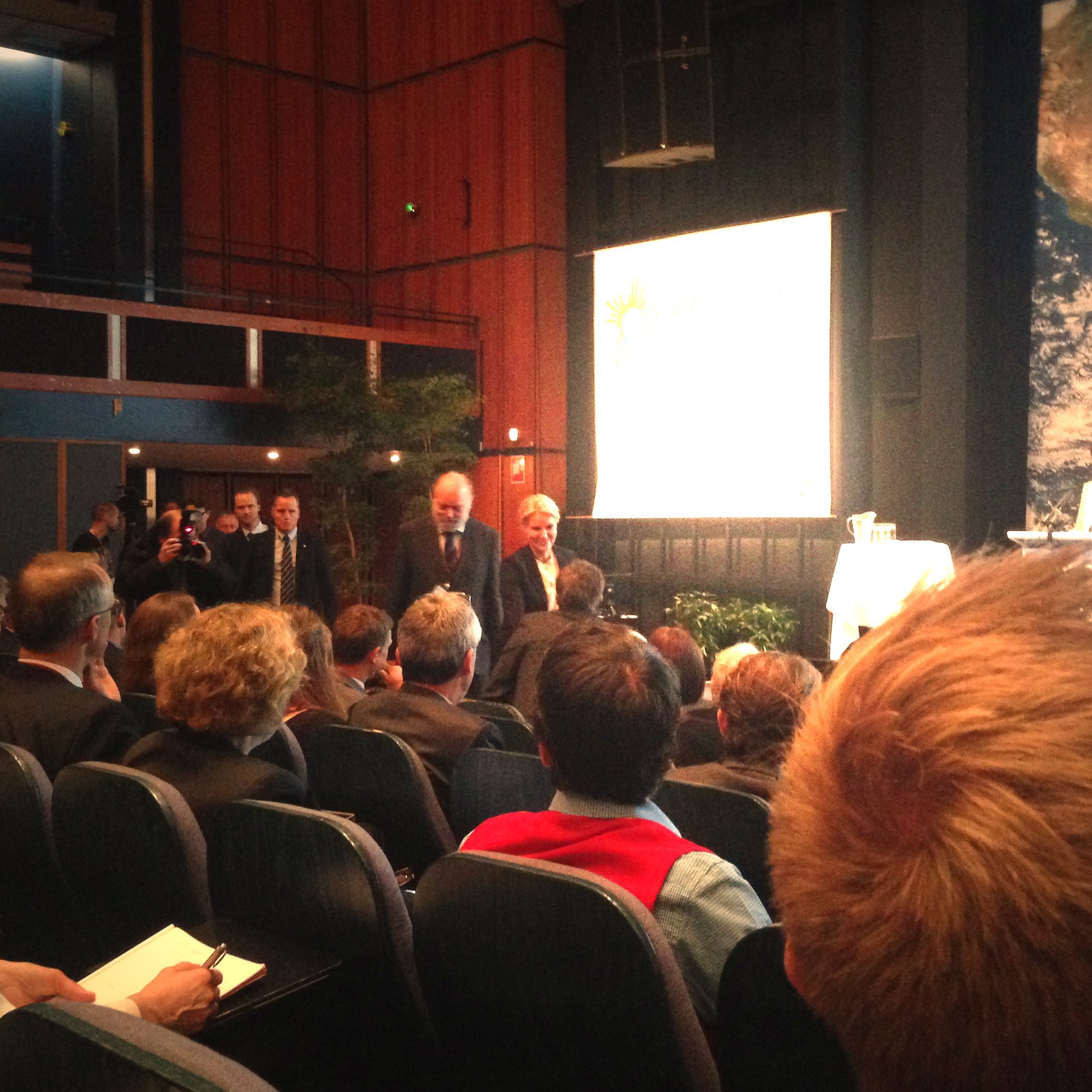 Umiddelbart en ganske almindelig plenarsal på en red verden-konference sådan cirka en times tid før frokost, men se nærmere på billedet: Fyren med det mørke hår, som springer op for at trykke næver med statsministeren, er Frederik, Danmarks næste konge. VIP-dag ftw!