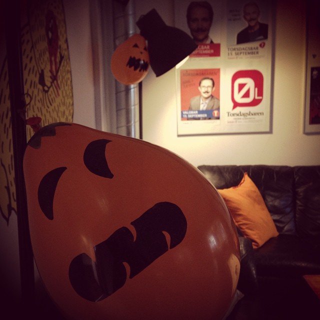 På en måde er det ikke den skræmmende ballon, der fanger opmærksomheden, så meget som de indrammede fan(?)-billeder af politikere på væggen.
