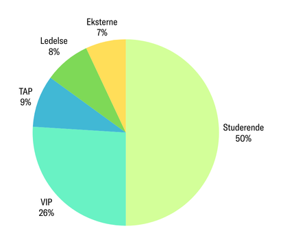VIP står for videnskabeligt personale, mens TAP står for teknisk-administrativt personale. Eksterne er alle, der ikke er studerende eller ansatte ved KU.