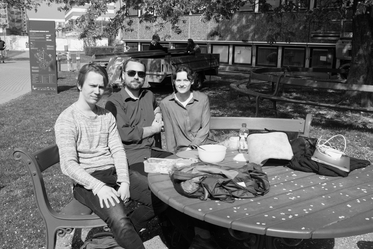 Niels, Morten og Camilla, som alle tre læser fysik på tredje år, er gået udenfor for at nyde deres frokost i det gode vejr.