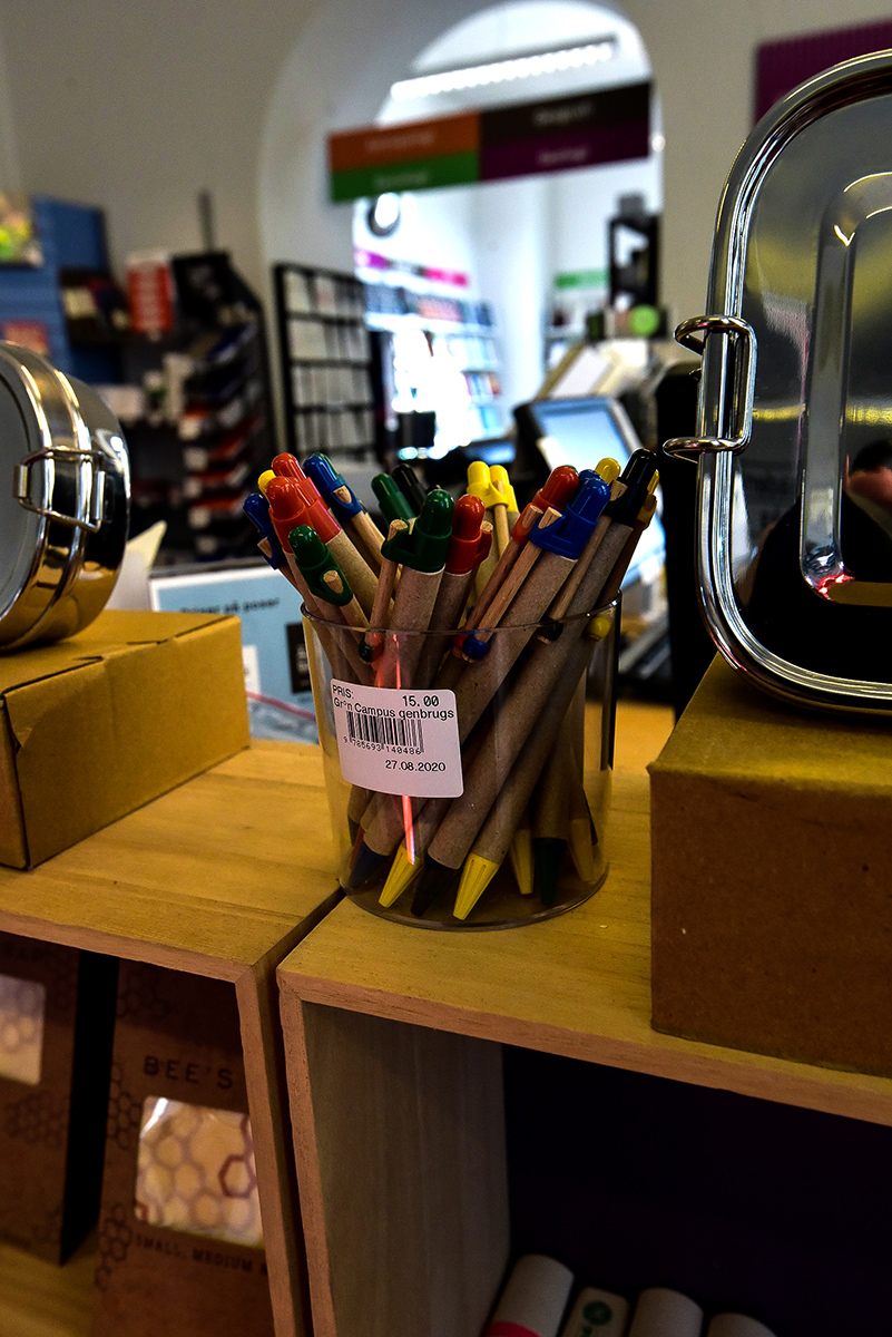 Hos Academic Books på Center for Sundhed og Samfund på Københavns Universitet deler bøgerne nu plads med genanvendelige termokopper fremstillet af kaffegrums, kuglepenne der kan genopfyldes, kladdehæfter af genbrugspapir og bivokslærred, der er et genbrugeligt alternativ til den stanniol eller plastikfilm, folk typisk pakker madpakken ind i.