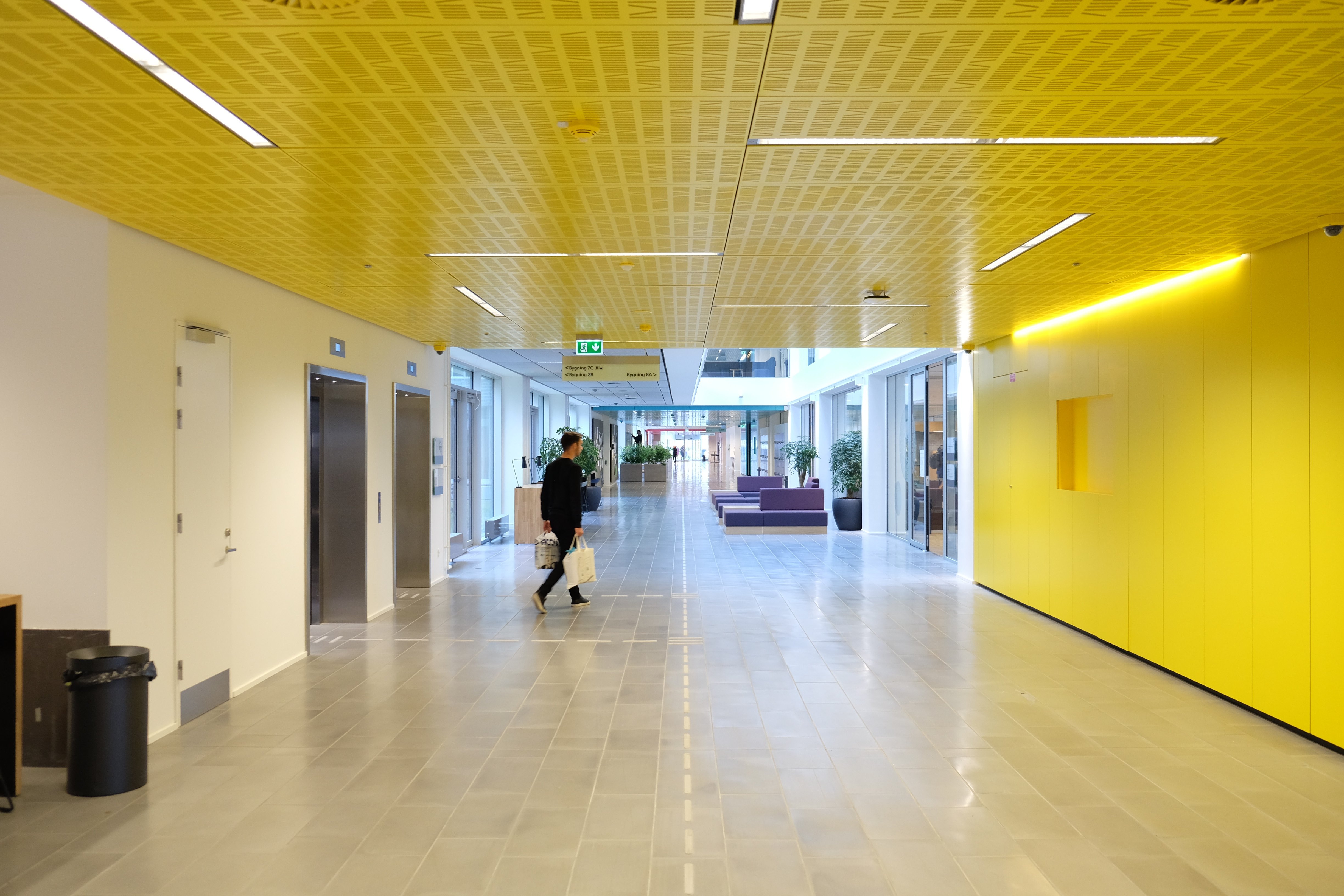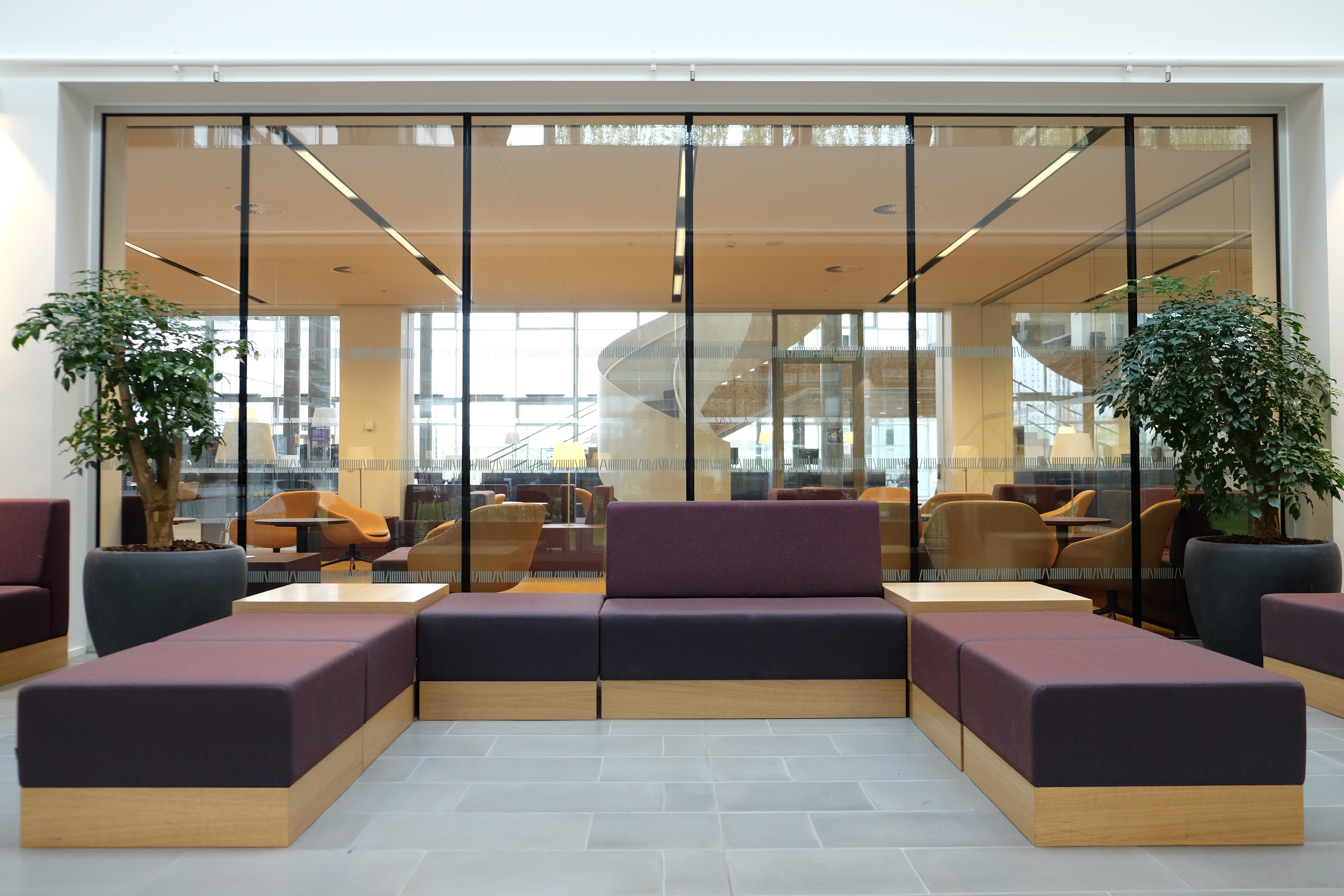 Der er store, åbne rum og lange gange, der kan give en fornemmelsen af at være i en mindre lufthavn, hvilket sikkert er inciterende for rejselysten. Det handler om at suspendere den hverdag så ofte som muligt og komme ud og opleve den verden. Og de mange lokaler, der ligger ud til gangen, har naturligvis også vægge af glas, og det er tydeligvis tanken med tiden at få åbnet nogle butikker derude. Der er kun 32 faste læsepladser til et fakultet med langt flere studerende, men heldigvis er der placeret sofagrupper og det, der ligner caféborde, her og der. Mange læsepladser er placeret på gangene eller forskudt over kantinen, som også kaldes markedspladsen, så det pulserende liv, hvor man omgås og kan høre andre omgås hinanden, hele tiden er tæt på. Der er plads til butikker på gangene, og cafébordene er placeret i overmål, og såfremt der allerede nu er et centralanlæg, der kan spille musik, der er motiverende for købelysten, er der rig mulighed for at lave et område med shopping i den afdeling af Søndre Campus, der er Det Teologiske Fakultet, og som sandsynligvis alligevel snart lukker. Markedspladsen er der allerede, dér hvor kantinen som nævnt holder til. I parentes bemærket serveres maden på nogle store, robuste borde med en blank metaloverflade. Efter lukketid er disse borde, der er fastgjorte til gulvet, særdeles velegnede til beer pong.