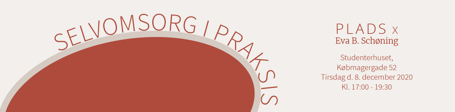 Other — I PLADS vil vi gerne invitere dig til vores event om selvomsorg. Det foregår i samarbejde med Eva B. Schøning og der vil både være korte oplæg, diskussion i fællesskab og tid til at arbejde med individuelle øvelser. Vi synes at selvomsorg er vigtigt - især nu hvor vintermørket og kulden er kommet og coronaen stadig påvirker vores dagligdag. Derfor glæder vi os til at sætte fokus på selvomsorg og hvordan vi passer på os selv og hinanden. Vi håber at du har lyst til at være med!