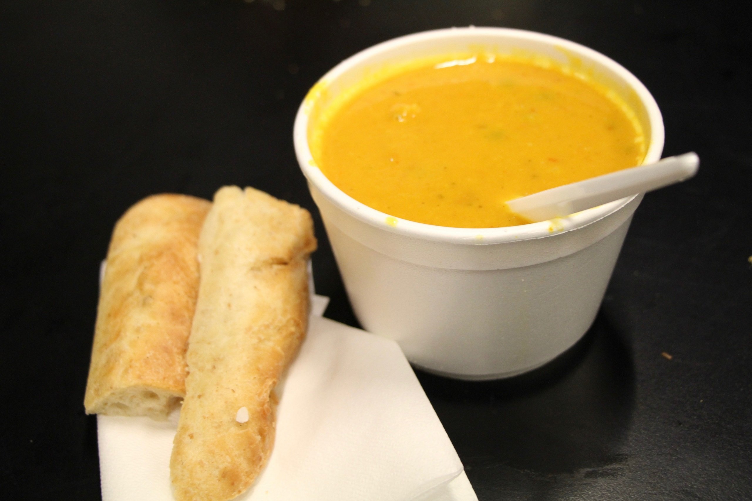 The concept is pay-as-you-feel, so if you’re pinching pennies at month’s end, feel free to not give a lot. After a bowl of creamy veggie soup and a slice of homemade bread you can return to the library with a full belly and a good conscience.