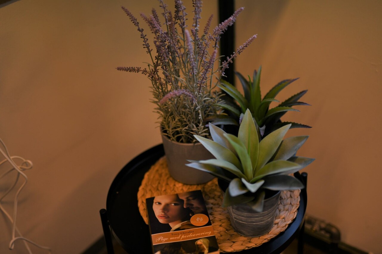 A sign says »Welcome to the Breathing Space – a break from daily life«. The walls are decorated with landscape images, lush plants grow out of every corner, and between two soft chairs, there is a basket with knitting kit for free use.