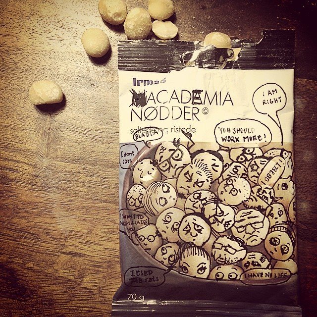 Here at the University Post, we’re all about spontaneous acts of artistic expression and puns. PHd Miya Kudo draws all over her bag of macadamia study snacks in a frenzy. Turns out, “(M)Academia makes you go NUTS!”
