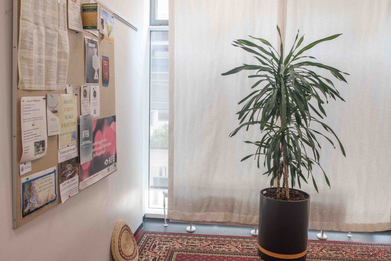 A couple of weeks later, the room has changed significantly. The scent of incense is gone. The ‘altar’ with the Middle Eastern cloth and the candelabra is now just an empty table, the bookshelf is bare, and several flyers have been removed from the notice board. The prayer mats that were in the bookshelf are also gone.