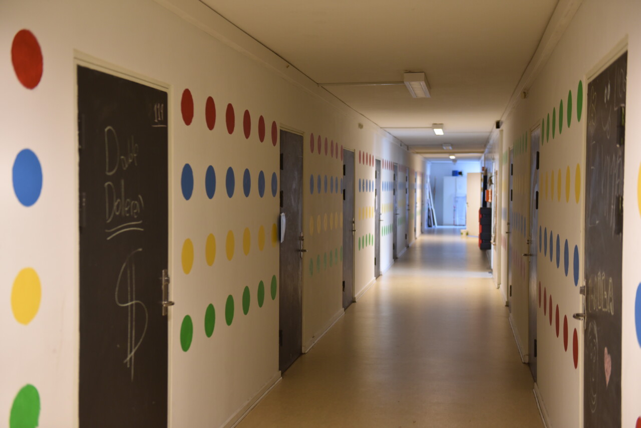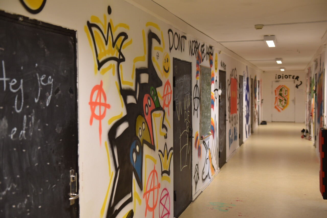 The walls of the long corridor on the 1st floor of Kollegiegården are adorned with Twister dots. These yellow, red, green, and blue spots fill the spaces between the 13 doors. If you go into the next corridor, you will find graffiti paint rather than multicoloured dots, and it feels like you are at a train station in the 90s, and two spray-painted trains have just entered the platform. The explanation for the multicoloured walls is the Danish dorm tradition of