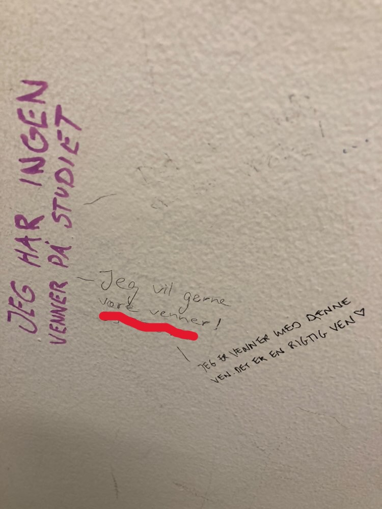 We visited rows and rows of toilet cubicles on several floors in all buildings on South Campus, and we really didn’t find that much. But we did see one thing that moved us, as good graffiti does. A vulnerable scribe had scribbled: »I have no friends on the programme.« Someone else then added the invitation, »I want to be friends!« with a phone number. And then, in a third handwriting, the addition: »I am a friend of this friend. This is a real friend.«