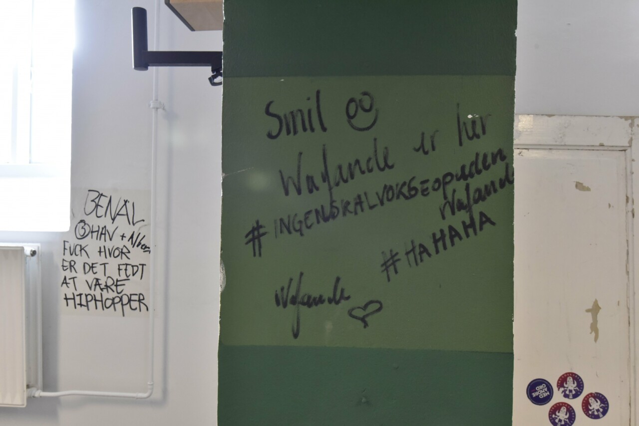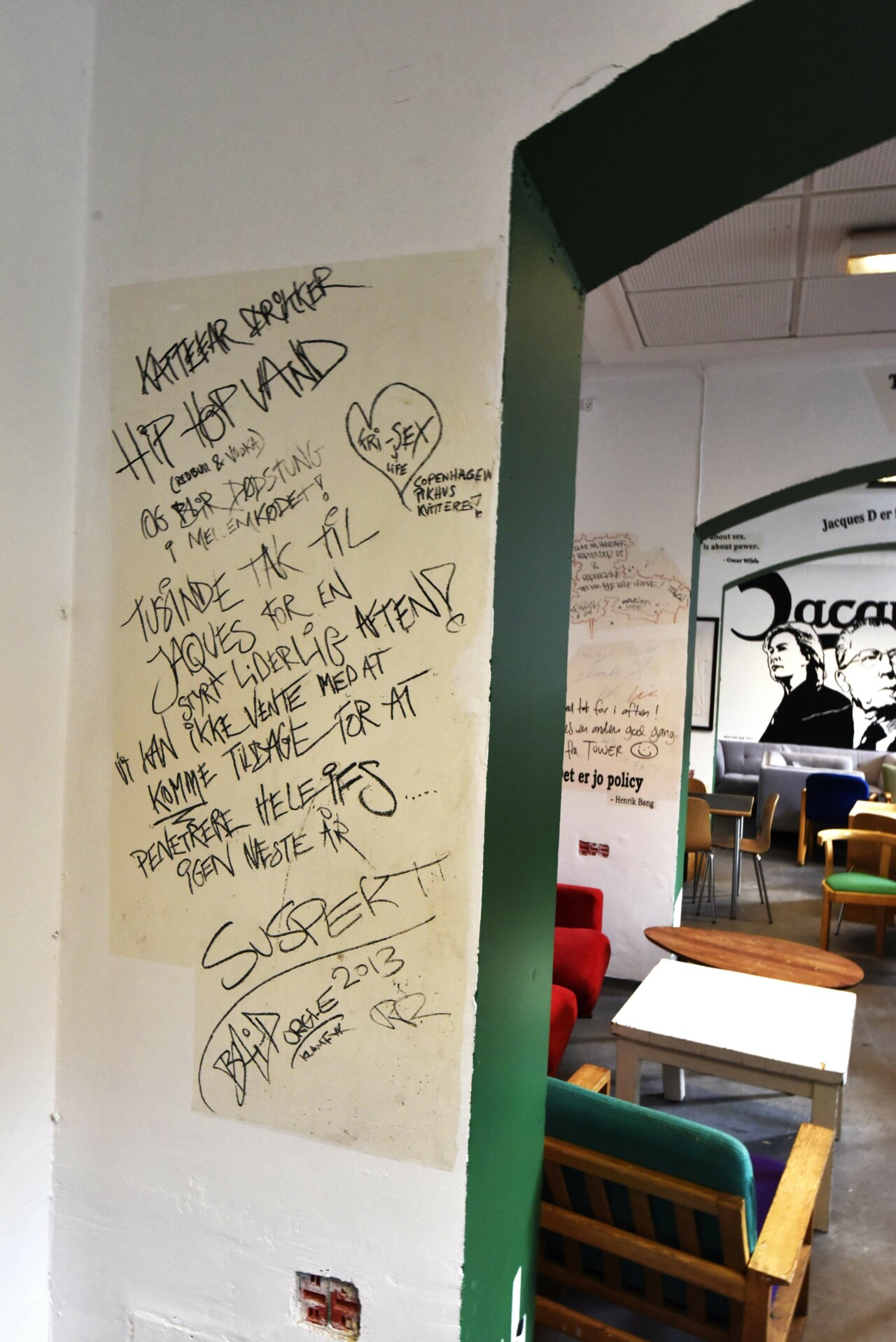 And the toilet cubicles were clinically clean in terms of messages, so you had to go into the student association’s rooms to find anything even closely resembling graffiti. The Jacques Delors bar is freshly painted. But they have carefully painted around what can best be described as wall greetings from musicians who have previously played at parties at political science. Here you will find Suspekt who in 2013 writes »thanks for a raunchy rave of an evening« and Benal who finds it »frigging cool to be a hip-hop«.