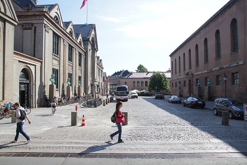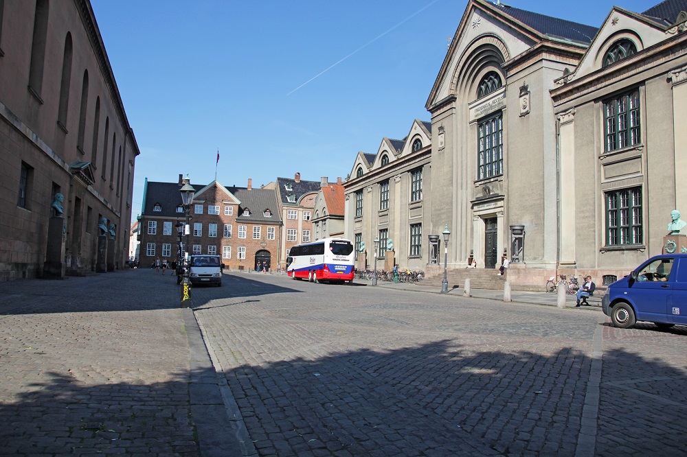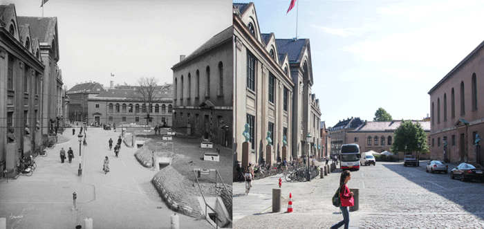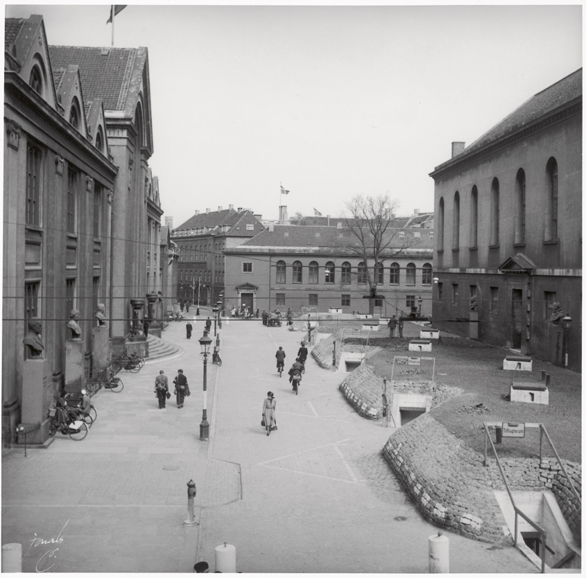 Air raid shelters that covered the square during World War II. They were removed shortly after the war, giving way to the more open cobble stones that exist today. Our photographer captured Frue Plads in the center of Copenhagen as it looks today from the same angle as the historical photos.