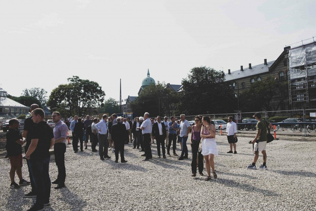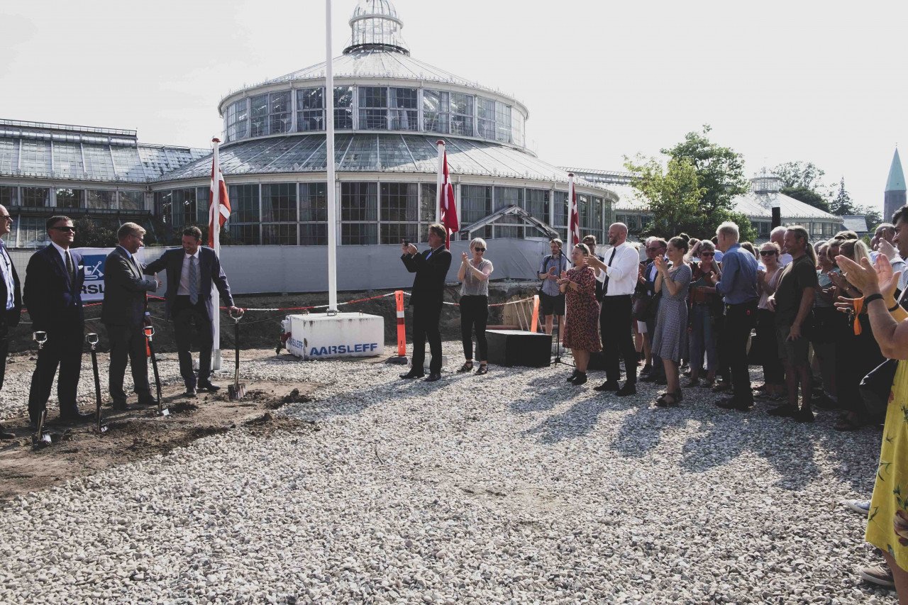 Solen banker ind på de gamle vinduer i Palmehuset i Botanisk Have foran os. Det er 27 grader denne onsdag eftermiddag, hvor over hundrede mennesker er samlet på en øde grusmark midt i Indre By. Samarbejdspartnere, arkitekter, fondsbestyrere og ansatte på Københavns Universitetet har ventet i næsten femten år på dette øjeblik: Det sagnomspundne byggeri af Statens Naturhistoriske Museum skal endelig til at gå i gang.