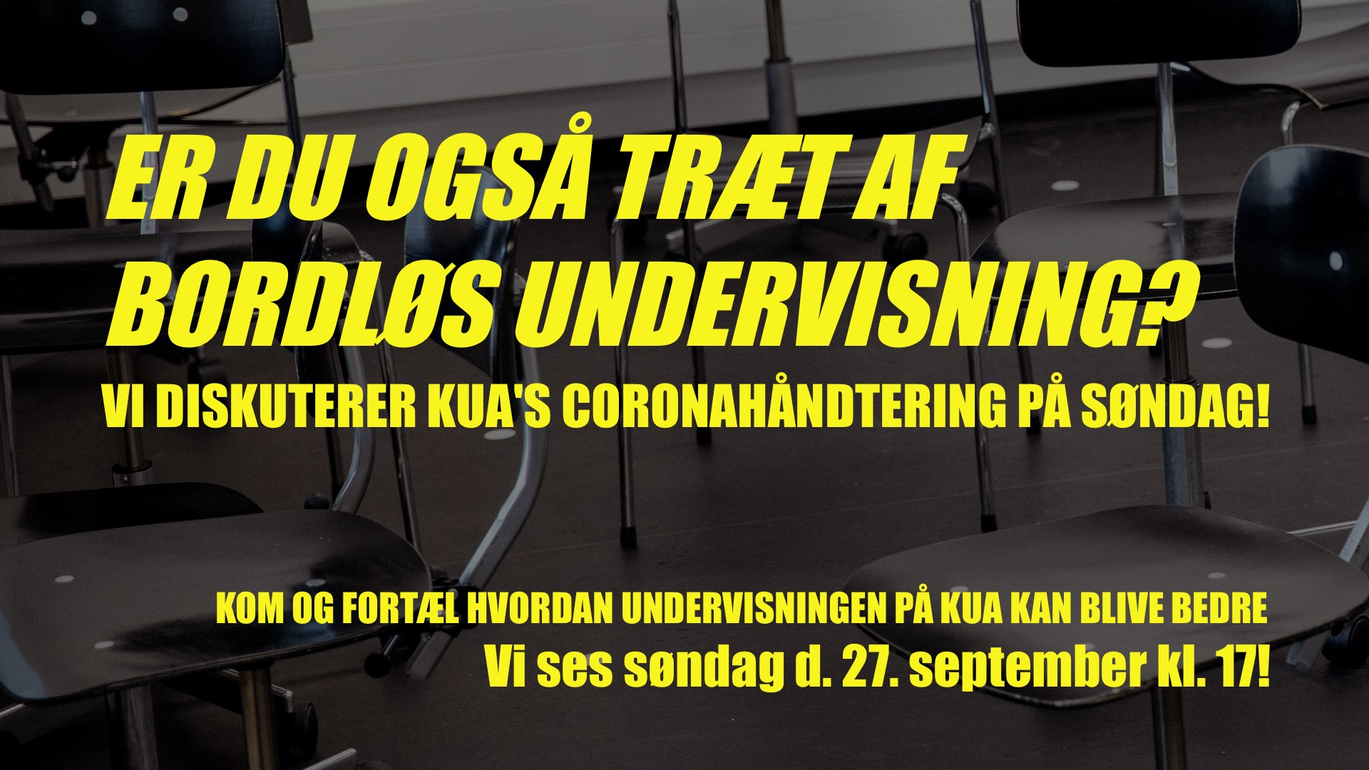 Debat — Er du træt af bordløs undervisning? Har du stærke holdninger til fakultetets corona-håndtering? Vil du havde indflydelse på om undervisningen skal være fysisk, online eller en blanding? Så kom med til ekstraordinært HUMrådsmøde nu på søndag hvor vi skal afgøre HUMrådets holdning til corona-håndteringen samt til universitetets igangværende arbejde om klima- og bæredygtighed.