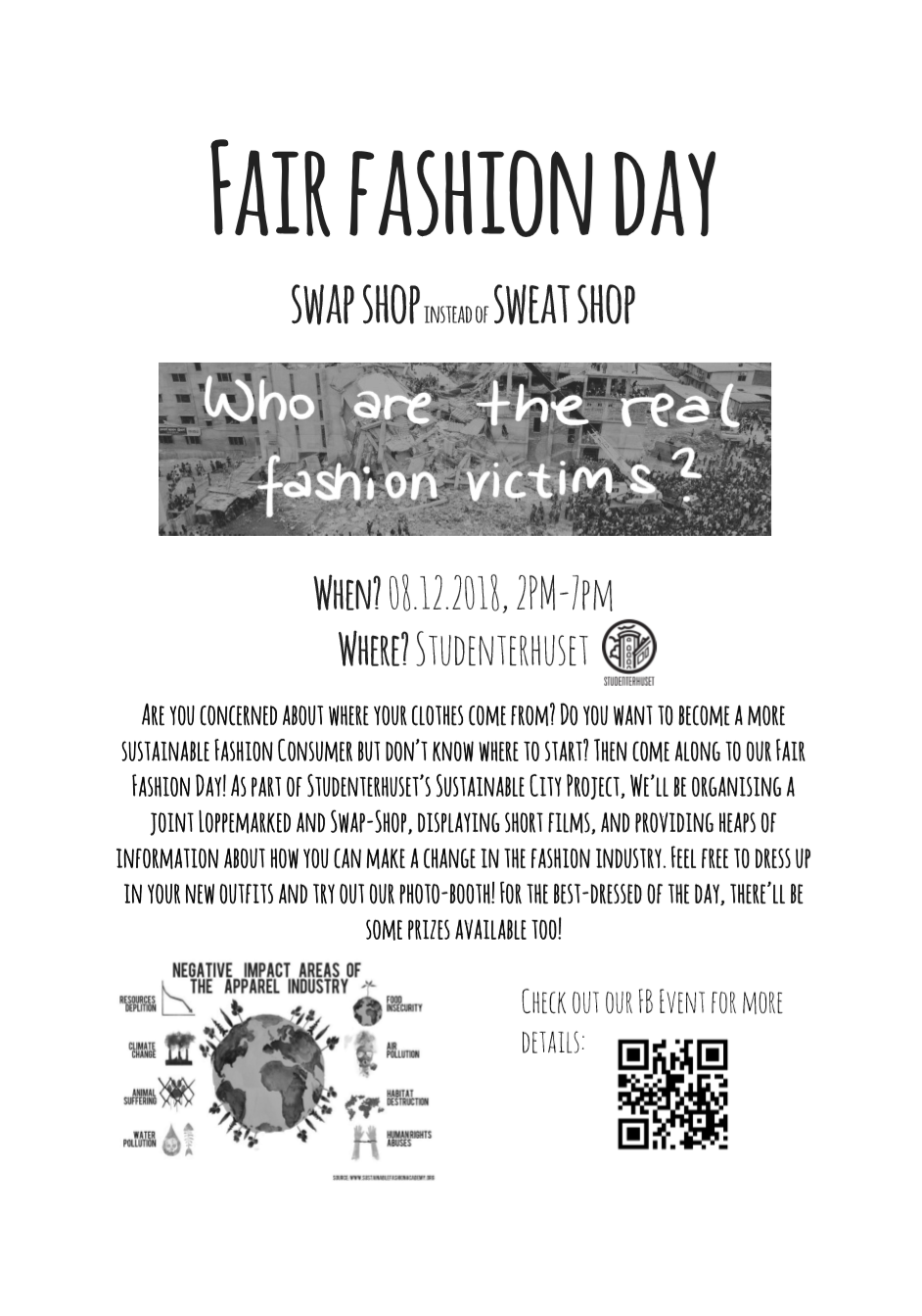 Øvrige — Do you want to give your clothes a fair chance? Then come along to the Fair Fashion Team’s free one-day event at Studenterhuset, focused on raising awareness about the sustainability issues associated with the fashion industry. There will be a joint loppemarked and swap-shop, where you can stock up on Christmas gifts and upgrade your winter wardrobe guilt free! During the day, we’ll be presenting some short films so you can learn more about the problems facing garment workers, and the steps we can take to drive change in the unsustainable fashion industry. Attendees will have the special opportunity to see our exclusive interview with sustainable fashion expert Kirsti Reitan Andersen. We’re also setting up a photo booth where you and your friends will be able to show off your new outfits, with the best dressed eligible to receive some nice prizes. At the end of the day, the funds raised will be going to Fashion Revolution, a global movement which aims to transform the fashion industry and wants to create a more ethical and sustainable future for fashion. So you can enjoy a fun day of shopping knowing your new clothes came at a low price. Help us spread the word: Swap Shops, not Sweat Shops! The Fair Fashion team Check out our FB-event: https://www.facebook.com/events/1070438723124955/ And look at https://www.fashionrevolution.org/about/ if you want more info about fair fashion.
