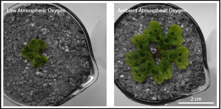 Our growth experiments on liverworts, which resemble the earliest land plants, suggest that both growth and reproduction would have been severely impaired if the plants grew in an atmosphere low in oxygen. This challenges the idea that early and widespread colonization by land plants alone increased atmospheric oxygen pressures to near modern levels.