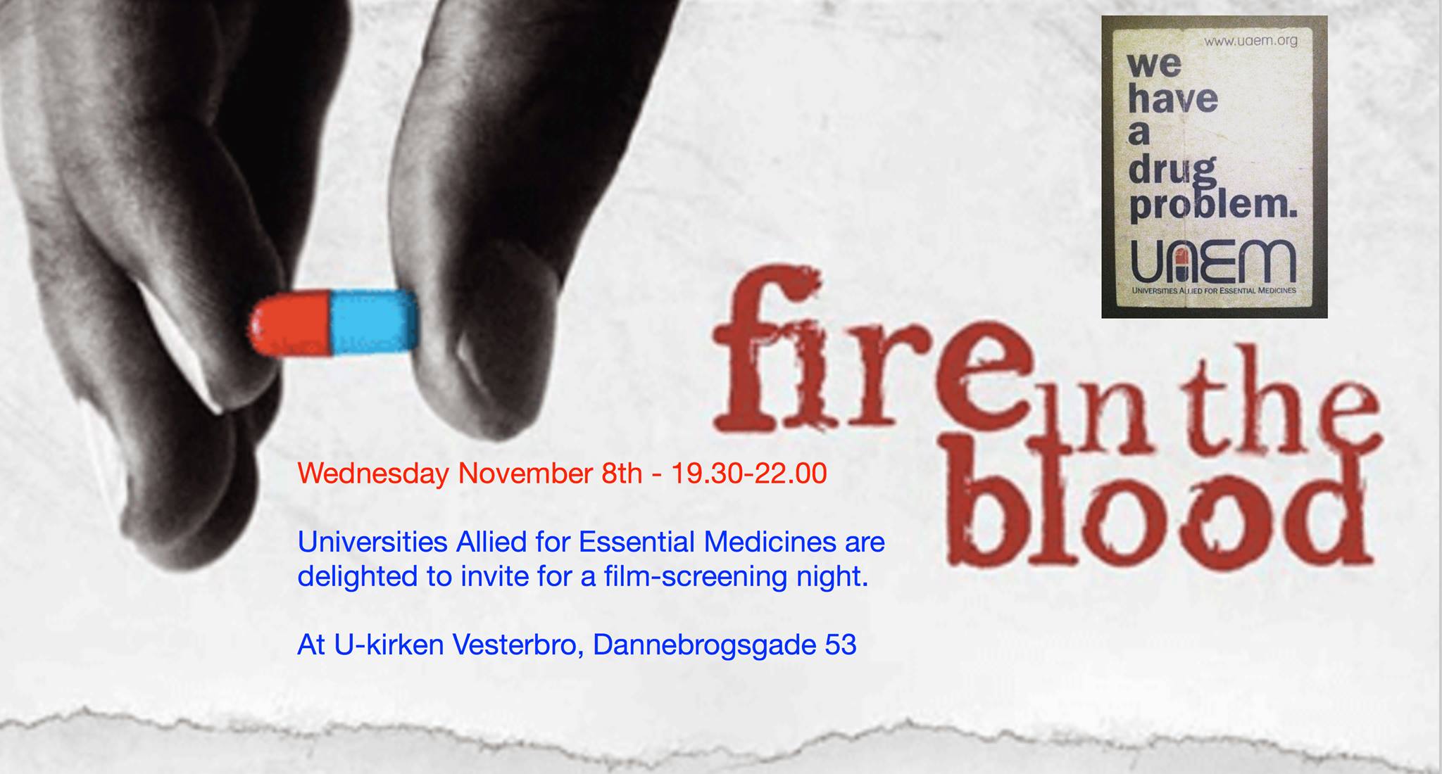 Øvrige — GRATIS FILMVISNING - Fire in the Blood Hvert år dør 10 millioner mennesker i verden, fordi de ikke kan få adgang til livsvigtig medicin. Den anmelderroste film Fire in the Blood belyser denne problematik og giver svar på hvorfor det står så galt til.