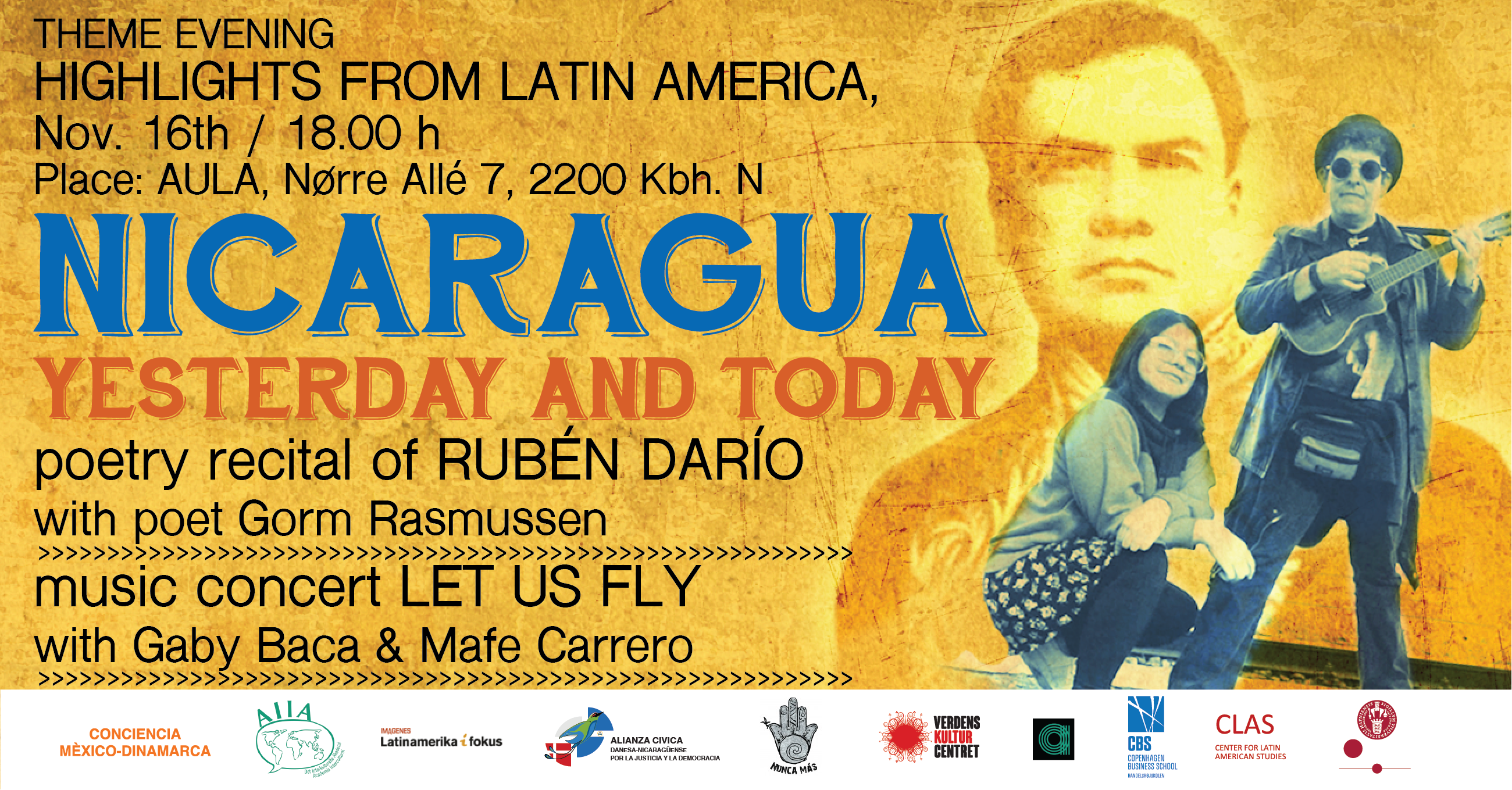 Øvrige — In the context of the thematic afternoons on Latin America, Academia Intercultural in collaboration with the Center for Latin American Studies – University of Copenhagen, Conciencia México–Dinamarca, Verdenskulturcentret, Imágenes Latinamerika i Fokus, Alianza Cívica Danesa-Nicaragüense por la Justicia y la Democracia, Nunca más - International Network for Human Rights and Psycho-Social Response,and CBS Copenhagen Business School are pleased to invite you to a Nicaraguan cultural evening, in which you will have the opportunity to enjoy a wonderful concert of the Nicaraguan songwriters Gaby Baca and Mafe Carrero and a beautiful poetic recital of Rubén Darío, in the voice of the poet Gorm Rasmussen.