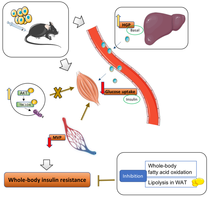 In Study 2, Lewis lung carcinoma (LLC) cancer impaired insulin’s stimulatory effect on glucose uptake in both muscle and adipose tissue and impaired microvascular perfusion in muscle. It also increases basal hepatic glucose production. Additionally, blockage of lipid flux partially alleviates cancer-induced IR which could be a novel pharmacological target for cancer treatment in the future.