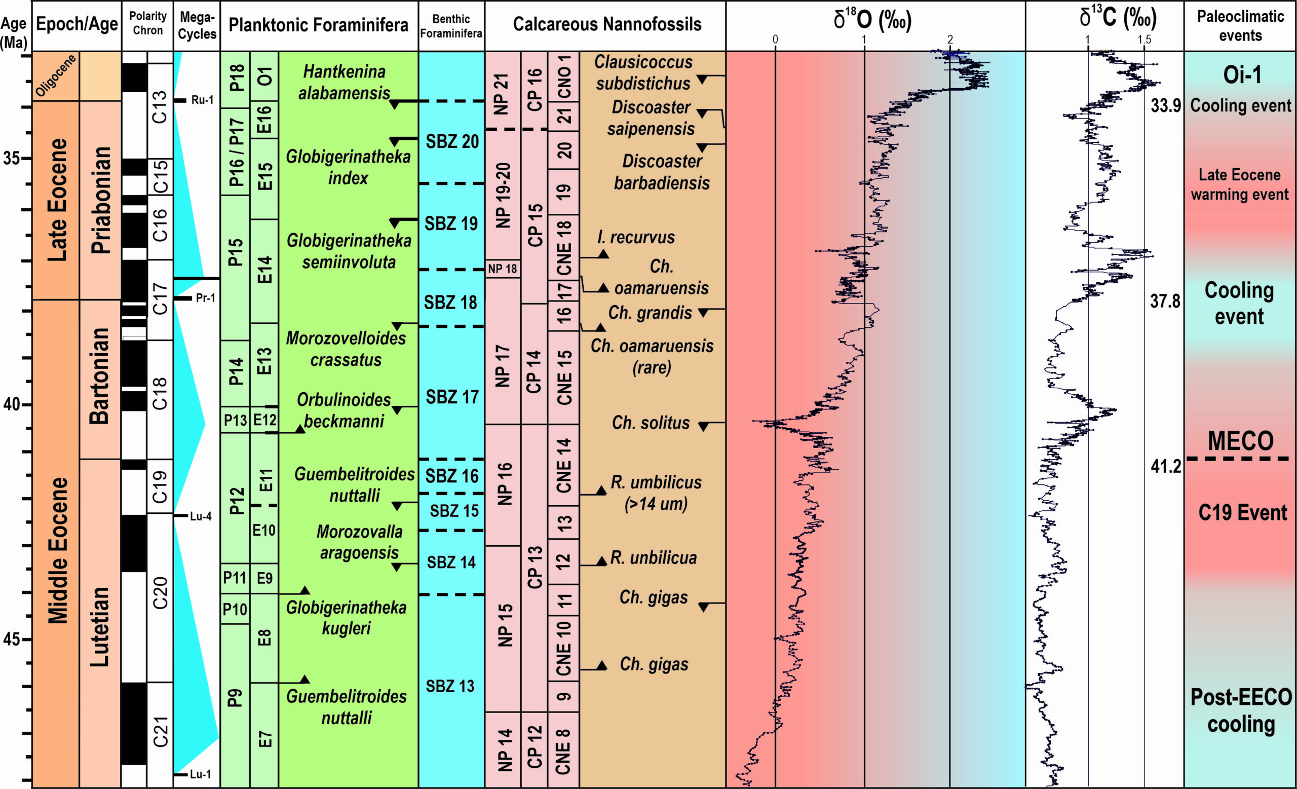 This thesis explores the middle Eocene-early Oligocene sedimentary archive to examine the enigmatic paleoclimatic events in the Mediterranean basin (Tunisia). Through this thesis, we conduct the first integrated research to understand the response of the southwestern Neo-Tethyan margin to the development from the greenhouse world towards the modern icehouse climate system. This thesis is unique in its use of a high-resolution multidisciplinary stratigraphic investigation of four sections selected along a transect perpendicular to the formal coastline allowing us to identify the effect of climate change on sedimentological facies and marine environments in the Tunisian dorsale through bio-, chemo-, and cyclostratigraphic investigation. The Lutetian-Bartonian boundary was identified for the first time by the base of nannofossil Reticulofenestra stavensis. The base of the Priabonian is placed at the acme base of the nannofossil Reticulofenestra erbae (37.89 Ma). The base of Clausicoccus subdistichus coincides in northeastern Tunisia with the extinction of the hantkeninides group and is used here to define the Eocene-Oligocene boundary at 34.03 Ma. The Middle Eocene Climatic Optimum (MECO) event has been placed in the lower CNE15 calcareous nannofossil zone exactly between 39.94 to 40.48 Ma. A transient period with increasing carbonate production and with a return to nummulite carbonate is manifested in the field by the deposition of the Reneiche / Siouf members that we associate with the onset of transient warming during the MECO. Our age-model advocates for non-deposition of the Reneiche /Siouf members in the deep basinal part of the Tunisian dorsale during the MECO interval. This interpretation supports a potential change in sediment source in our investigated area. Astronomical calibration of the El Rahma section (NE Tunisia) with the semi-quantitative abundance patterns in calcareous nannofossils allowed us to identify the Discoaster Extinction Event (DEE, 34.35 Ma). A positive carbon isotope excursion is recorded after the DEE and correlates to open‐ocean records of the Pacific. The Oi‐1a (32.75 Ma) glaciation event coincides in the Southern Neo‐Tethys with a major sea‐level drop. Enhanced obliquity power occurs before the EOB, immediately above the DEE, supporting late Eocene increase in ice volume growth as the trigger of monsoonal and ocean circulation changes that affected tropical latitudes of the southern Neo‐Tethys.