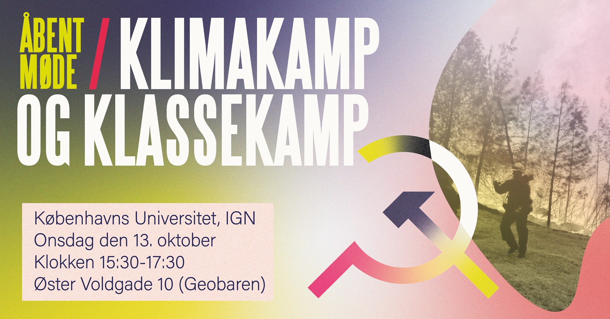Debat — Kom med til møde og diskuter klimakrisen og hvordan vi løser den! Øster Voldgade 10, Institut for Geovidenskab og Naturforvaltning i Geobaren (der vil være skilte, der viser vej fra hovedindgangen). Skovbrande, storme, oversvømmelser og tørke. Ekstreme vejrbegivenheder og naturkatastrofer er ved at blive den nye normal, og IPCC har nu estimeret, at vi med stor sandsynlighed vil ramme en 3 graders temperaturstigning inden år 2100. Langt over de 1,5-2 grader, som 188 nationer med Parisaftalen svor, at vi ikke måtte overstige. Konsekvenserne er stigende global ulighed, et smadret fødevaresystem og ødelæggelsen af millioner af menneskers levebrød og bosteder. Som direkte resultat af dette vil over 1 milliard mennesker være drevet på flugt inden 2050. Der er efterhånden konsensus om, hvor omfattende og alvorlig klimakrisen er. Men som den nye landbrugsaftale viser, er der lang vej til reel handling, mens tomme løfter og hensigtserklæringer slynges vidt omkring. Det bliver mere og mere åbenlyst, at politikerne ikke kan løse hverken den klimatiske eller sociale krise som verden står over for. Verdens rigeste 10% står for over 50% af verdens CO2-udledninger, mens de 50% fattigeste af verdens befolkning kun udleder 10%. Alligevel er det gang på gang arbejderklassen, der bliver bedt om at betale regningen. I det globale syd er konsekvenserne ødelagte livsvilkår, mens arbejderne i det globale nord skal betale gennem politisk forbrug. Og det nytter intet. Energisektoren alene står for 72% af de globale CO2 udledninger. Derfor må det stå klart, at ethvert forsøg på at mitigere den globale klimakrise må hive fat i problemets rod - den fossile økonomi og det kapitalistiske system. Derfor tager vi en tur tilbage til industrialiseringen og undersøger den fossile økonomis oprindelse og sammenhæng med kapitalismens opblomstring. På trods af, at verdens topforskere har gjort det klart, at vi allerede nu besidder teknologien til at omlægge vores energisystem til 100% vedvarende energi, går omstillingen i bedste tilfælde alt for langsomt. Klimakrisen er et tydeligt udtryk for et system i krise. Et system baseret på selvopretholdelig vækst på baggrund af udbytningen af arbejderklassen og naturen. Derfor hænger spørgsmålet om klimakamp uadskilleligt sammen med spørgsmålet om klassekamp! Hvis vi nogensinde skal rette op på de skader, vi har påført klimaet, må vi omvælte kapitalismen til fordel for et system, hvor produktionen er baseret på menneskelige behov frem for profit, og hvor klimaet sættes højere en den herskende klasses interesser. Kom med til møde og diskuter klimakrisen, og hvordan vi løser den. Alle er velkomne, og ingen forhåndsviden er nødvendig!