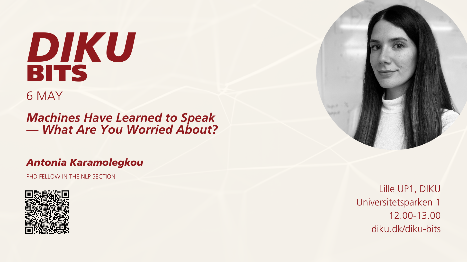 On Tuesday, 6th of May from 12.15-13.00 in Small UP1, Antonia Karamolegkou from the NLP section will speak at DIKU Bits.