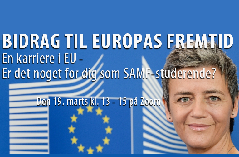Konference — MØD MARGRETHE VESTAGER Kom og bliv inspireret til dine mange muligheder ved Margrethe Vestager og hør om en spændende hverdag i EU og ikke mindst, hvordan du kan bidrage til Europas fremtid. Der er brug for skarpe samfundsvidenskabelige kandidater i EU.