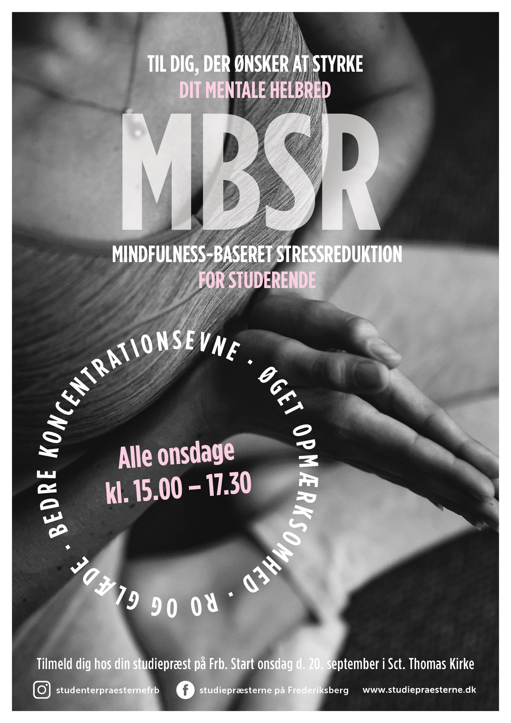 Øvrige — Til dig der ønsker at styrke dit mentale helbred. Mindfulness baseret stress reduktion (MBSR) består af 2,5 times undervisning i 8 uger, samt en hel 1 dag. Igennem siddende, liggende og gående meditation, mindful yoga, kropscanninger og korte oplæg om mindfulness, stress, nervesystemet og kommunikation vil du kunne opnå: Bedre koncentrationsevne og mentalt overskud Bedre relationer og samarbejdsevner Mere ro på tanker Mere positivitet, ro og glæde Redskaber til at opnå ro i stressede situationer Det kræver ingen forudsætninger at deltage! Datoer: 20.09, 27.09, 04.10, 11.10, 25.10, 01.11, 04.11, 15.11, 22.11 onsdage kl. 15.00 – 17.30, og lørdag 04.11 kl. 10.00 – 15.00