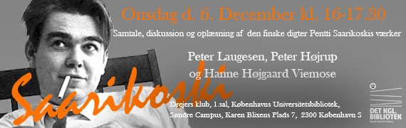 Foredrag — LiT.House sætter fokus på en af den finske litteraturs mest fascinerende skikkelser, nemlig digteren og prosaisten Pentti Saarikoski (1937-1983). Peter Laugesen, Hanne Højgaard Viemose og Peter Højrup vil præsentere os for forfatterskabet samt læse op af og diskutere deres yndlingspassager fra Saarikoskis lyrik og prosa.
