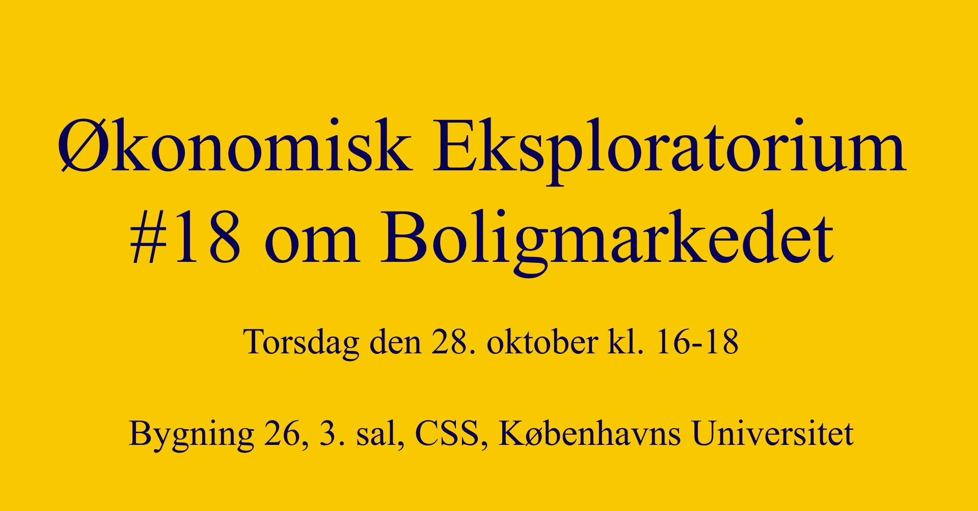 Øvrige — Der er udfordringer på boligmarkedet både på kort sigt i form af faren for en prisboble og finansiel ustabilitet og på lang sigt med ulighed på tværs af land og by, unge og gamle, og lejere og ejere. Er der behov for et indgreb på boligmarkedet? Og hvilke værktøjer virker bedst til hvilke problemer? Det er nogle af de spørgsmål Jeppe Druedahl og Søren Hove Ravn vil forsøge at besvare til Økonomisk Eksploratorium #18 om Boligmarkedet torsdag den 28. oktober kl. 16 på 3. sal i Bygning 26.