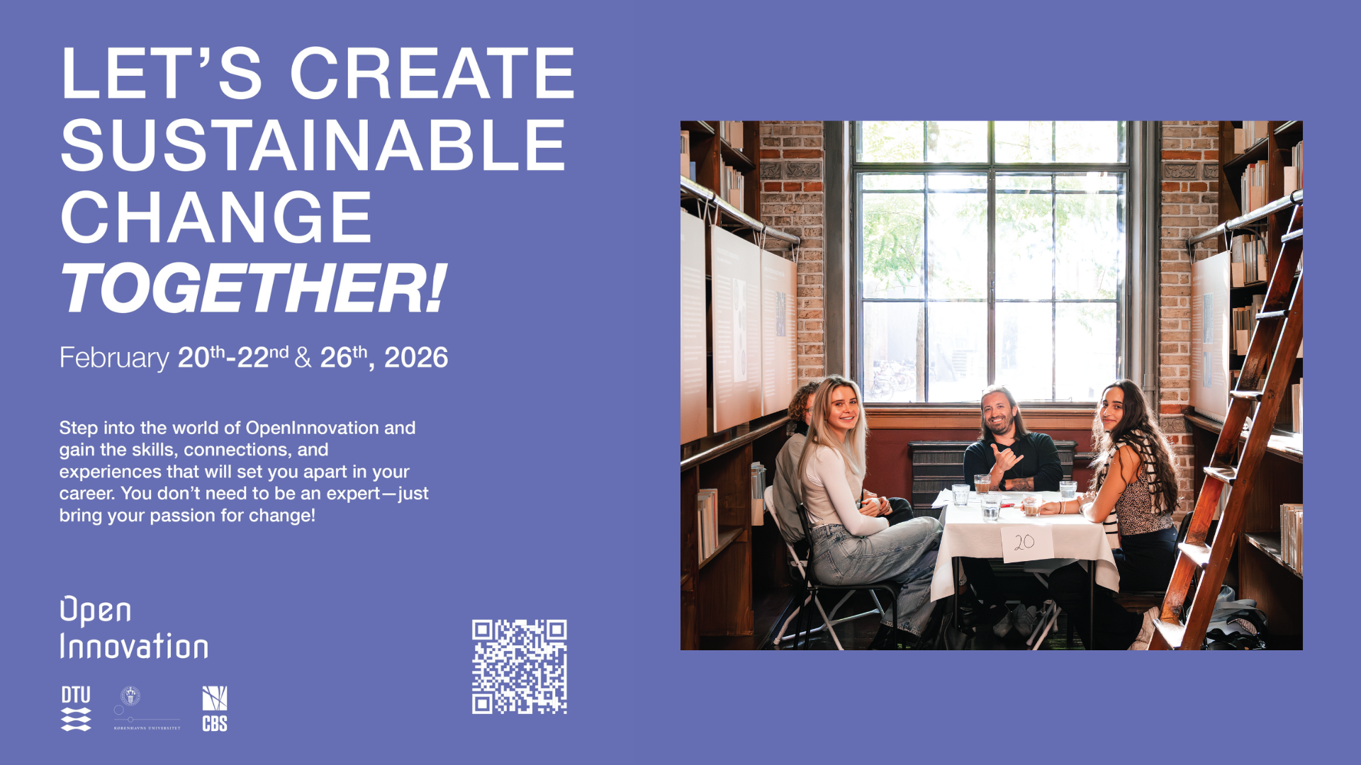Øvrige — Join Open Innovation and team up with students across universities to solve real healthcare challenges alongside partners like Kræftens Bekæmpelse and Lundbeck. Boost your CV, meet new people, and create meaningful change — all free, with food and drinks included.