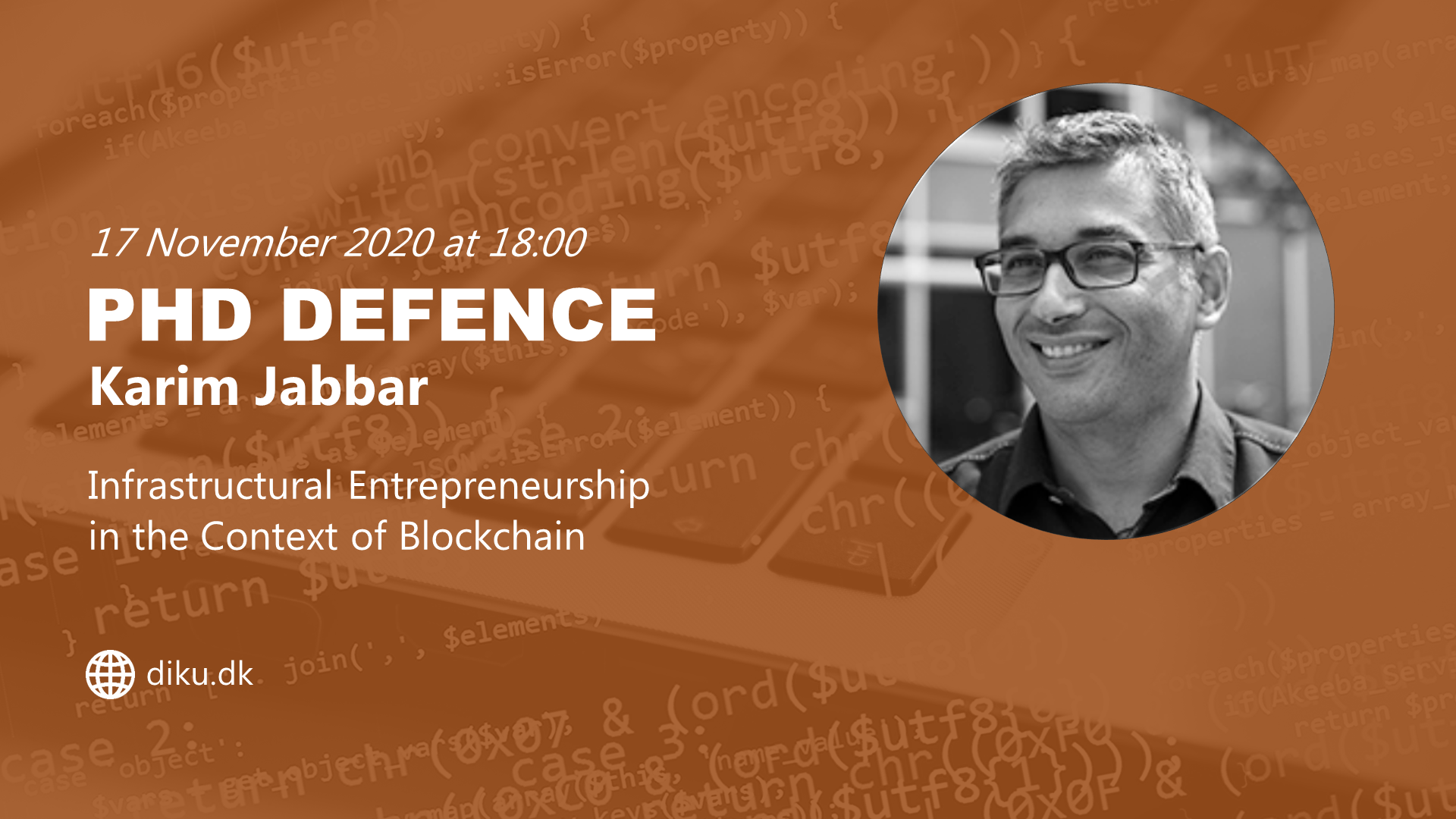 Ph.d.-forsvar — On 17 November Karim Jabbar will defend his PhD thesis titled: Infrastructural Entrepreneurship in the Context of Blockchain.