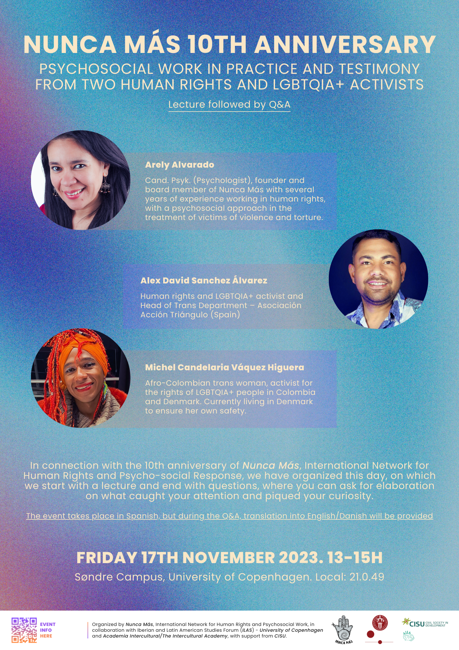 Debat — In connection with the 10th anniversary of Nunca Más, International Network for Human Rights and Psycho-social Response, we have organized this day, on which we start with a lecture and end with questions, where you can ask for elaboration on what caught your attention and piqued your curiosity. The event will be in Spanish, but during the Q&A session, translation into English/Danish will be provided. PROGRAM 1. Welcome by external lecturer Elena Ansótegui [Iberian and Latin American Studies Forum(ILAS)-AT Copenhagen University] and cand. psych., Arely Alvarado (founder of and board member of Nunca Más - International Network for Human Rights and Psycho-Social Response) 2. Who is Nunca Más and what is the psychosocial approach they work with (combining human rights with psychosocial work with inspiration from Latin America) and introduction of today's panellists and the theme by Arely Alvarado. 3. The psychosocial work based on the testimony of David Sanchez A., a migrant and human rights homosexual LGBTQIA+ activist., Head of Trans Department of Asociación Triángulo in Spain. 4. Ni Una Más concept from an Afro-Latin American migrant and trans LGTBQIA+ activist Michel Candelaria, Afro-Colombian trans woman, activist for the rights of LGBTQIA+ people in Colombia and Denmark. 5. Questions and answers (Q&A) Organized by Nunca Más, International Network for Human Rights in collaboration with Iberian and Latin American Studies Forum (ILAS) - University of Copenhagen and Academia Intercultural/The Intercultural Academy with support from CISU.