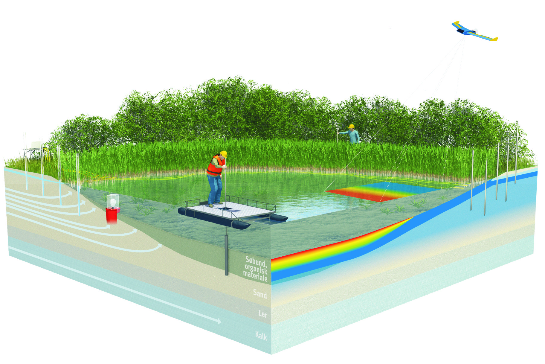 Efter ti års bevilling fra Villum Kann Rasmussen Fonden er Center for Sørestaurering (CLEAR) ved at nå sin afslutning. Formålet med centrets arbejde har været at etablere ny viden om, hvordan man kan bringe de meget næringsrige og uklare søer til en mere klarvandet tilstand og hvorledes de mere næringsfattige lobeliesøer kan sikres mod yderligere forringelse. Endelig har der i centrets forskning været fokus på at få en større viden om hvorledes grundvand, søer og biologi er koblet. Det er det sidste formål der er centrum for dette foredrag. Der gives eksempler fra arbejdet i de to jyske søer Hampen sø og Vængsø. Hampen sø er påvirket af næringsstof, der udvaskes til søen fra omkringliggende marker med konventionel landbrugsdrift via grundvandet til søens bund. Vængsø er belastet af fosforholdige geologiske aflejringer i søens omgivelser, der over en tidsskala på tusinder af år udvaskes til søen. Vængsø karakteriseres som en naturlig eutrof sø. De biologiske forhold i søerne er således betinget af forhold der sker i oplandet og det omgivende grundvand som følge af menneske- og naturskabte forhold. Problemstillingerne er komplekse og kræver et samarbejde på tværs af discipliner som geologi, hydrologi og biologi.