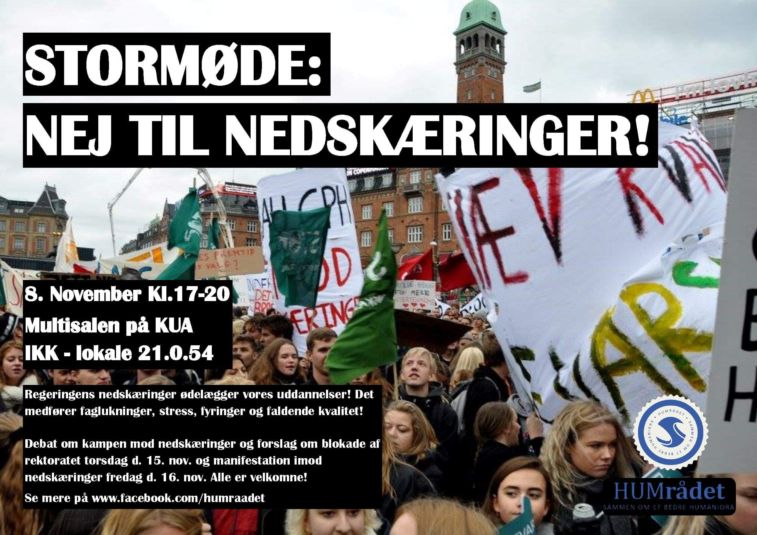 Debat — Regeringens nedskæringer ødelægger vores uddannelser! Det medfører faglukninger, stress, fyringer og faldende kvalitet! Derfor indkalder HUMrådet til stormøde! Vi skal diskutere hvordan vi kæmper imod nedskæringerne og forslag til protestaktioner. Vi har brug for alle kræfter, så kom med! Alle er velkomne!