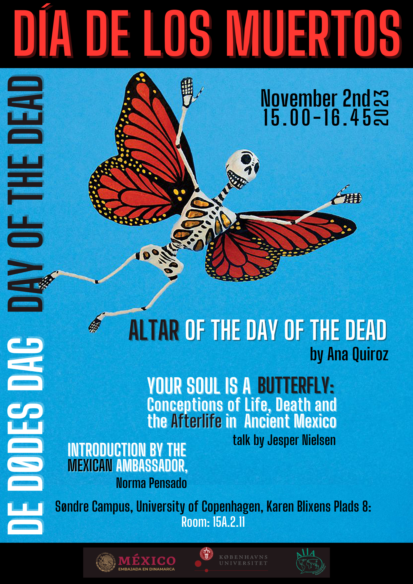 Øvrige — The Embassy of Mexico in Denmark, the University of Copenhagen and The Intercultural Academy will celebrate the Day of the Dead with talk "Your Soul is a Butterfly: Conceptions of Life, Death and the Afterlife in Ancient Mexico" by Associate Professor Jesper Nielsen. Ana Quiróz, a Mexican artist, will build a traditional Altar with the Cartonería Technique to show how Mexicans create an offering to be received by the souls of their loved ones on the 1st and 2nd November. @Piel de Alebrije. The Ambassador of Mexico, Norma Pensado, will introduce the event.