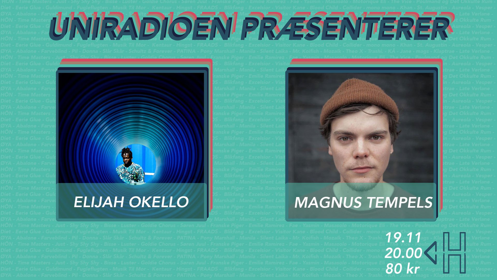 Øvrige — Uniradioen Præsenterer er en koncert hvor upcoming navne fra det nordiske vækstlag kommer og spiller. Denne gang er det de talentfulde Elijah Okello og Magnus Tempels der spiller. Det er arrangeret af Uniradioen og foregår på Huset i København.
