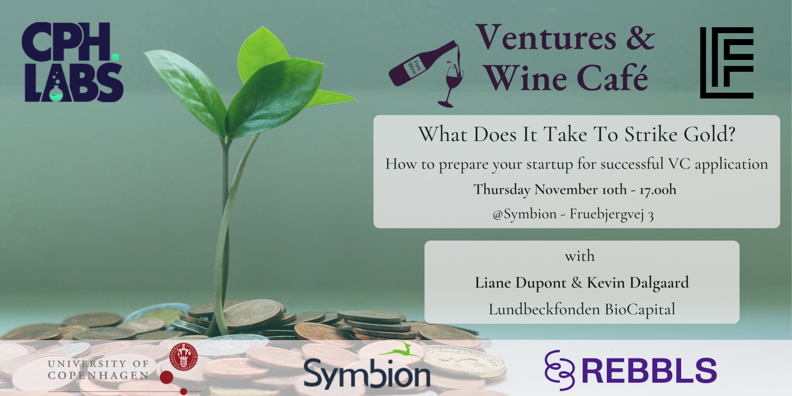 Seminar — Join us for the next Ventures and Wine on the 10th of November, 17:00, at Symbion where Liane Dupont and Kevin Dolowy Dalgaard from Lundbeckfonden will share details of the BioCapital programme and tips and tricks for how to best prepare for the VC application.