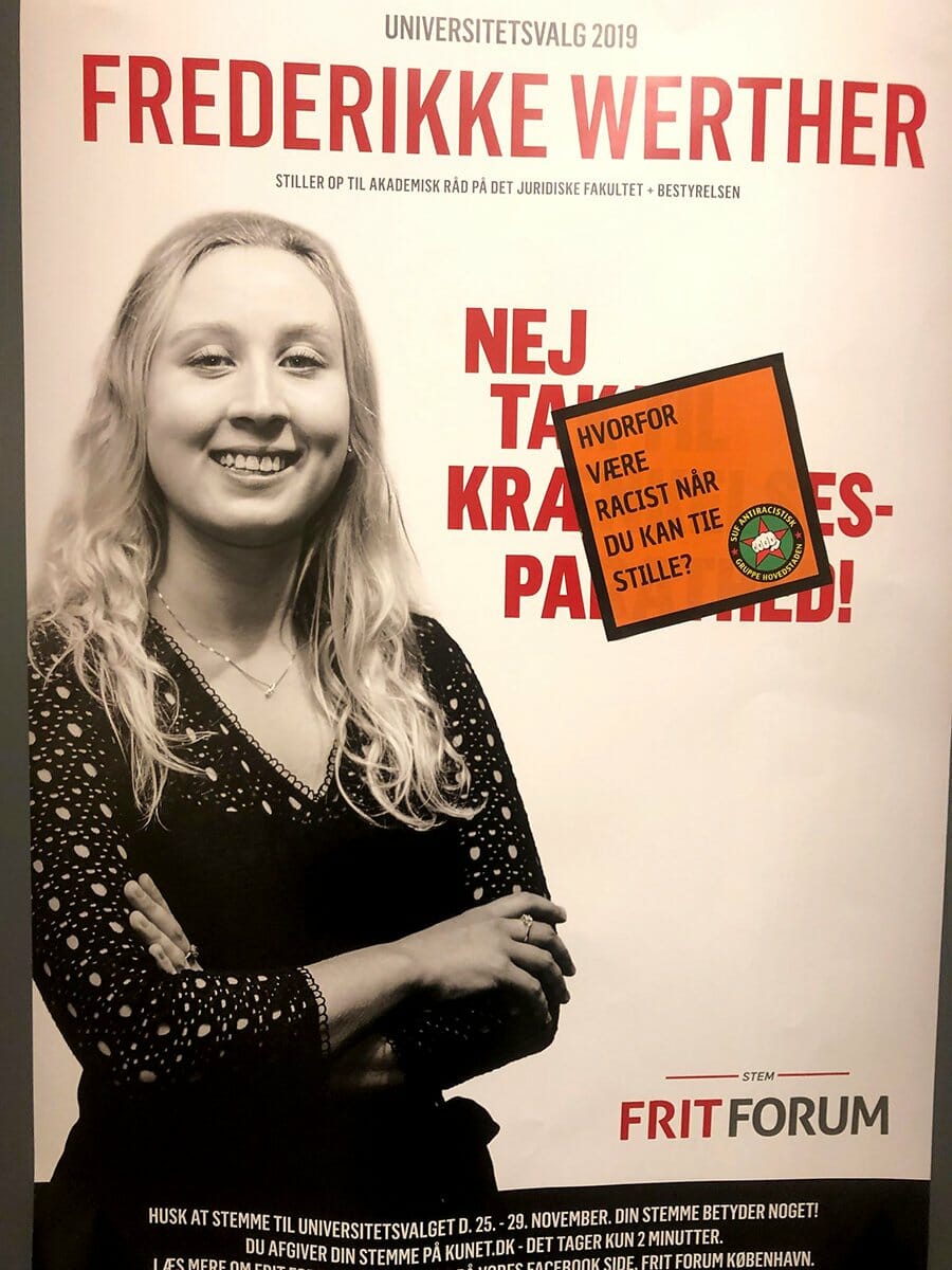 Her blev der opfordret til at ødelægge Frit Forums plakater. Årsagen skal også her findes i, at jeg er kritisk over for, hvad jeg oplever som et stigende identitetspolitisk pres på Københavns Universitet.
