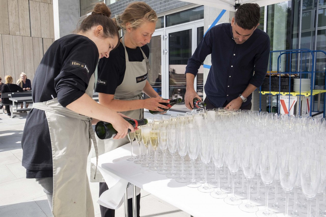 Blandt spritnye bordebænkesæt, et enligt mikrofonstativ og nyplantede træer myldrer pausetrængende studerende og ansatte frem; med en kanapé fra Mødestedets særopstillede kagebord i den ene hånd og et glas champagne i den anden.