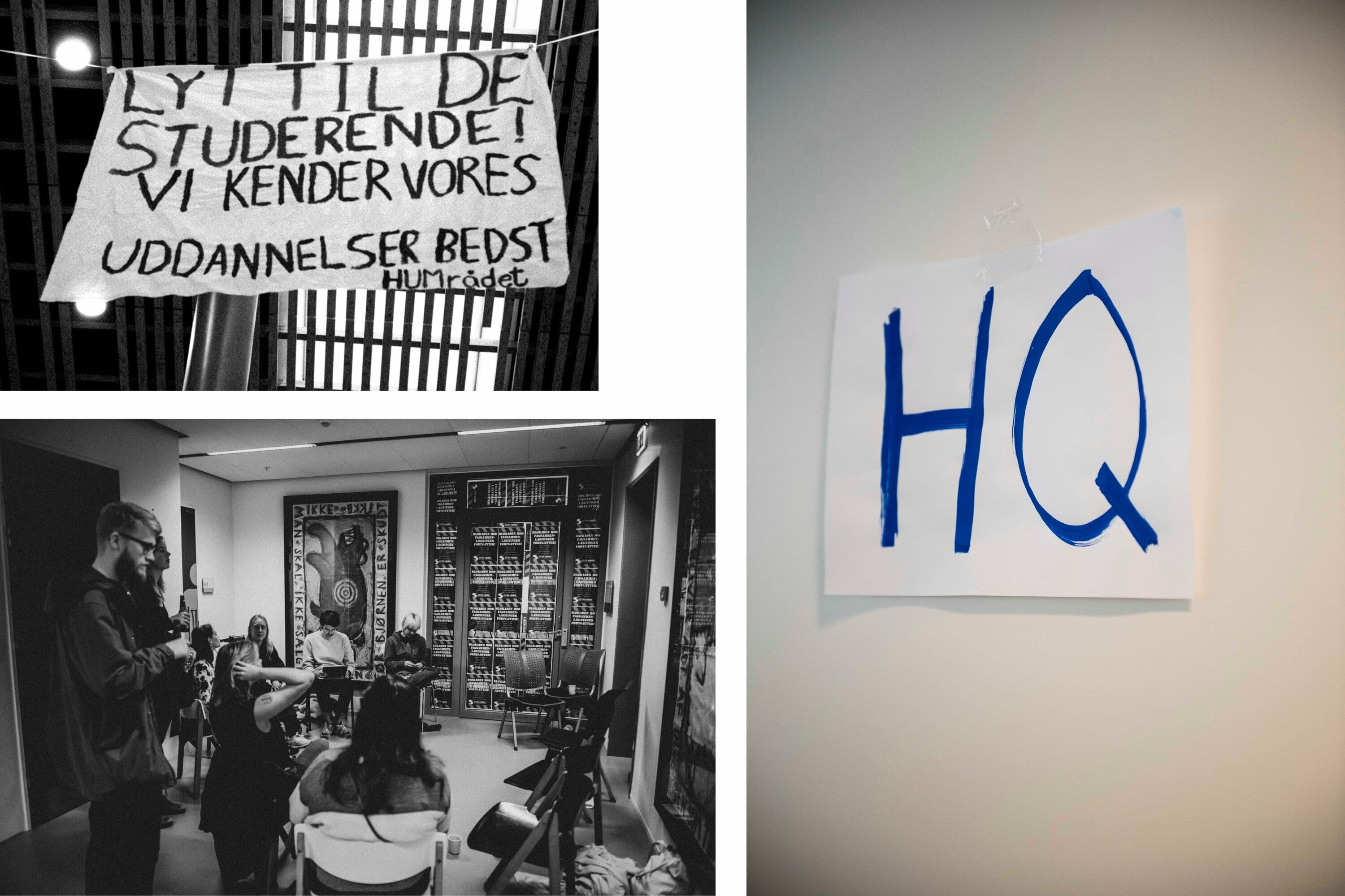 Hun kigger på tre historiestuderende, der sidder og småsludrer foran den glasdør, der normalt er gennemsigtig, men i dag er sort af påklistrede plakater: »Vi støtter HUM-rådet og besætter dekanatet,« står der på dem.