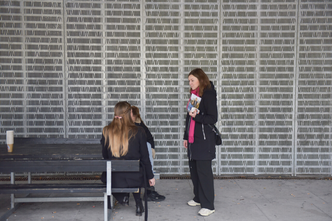 Hun giver en juicebrik til en anden studerende. »Ved du, hvad du skal stemme,« spørger hun ham. »Det ved jeg nu,« siger han.