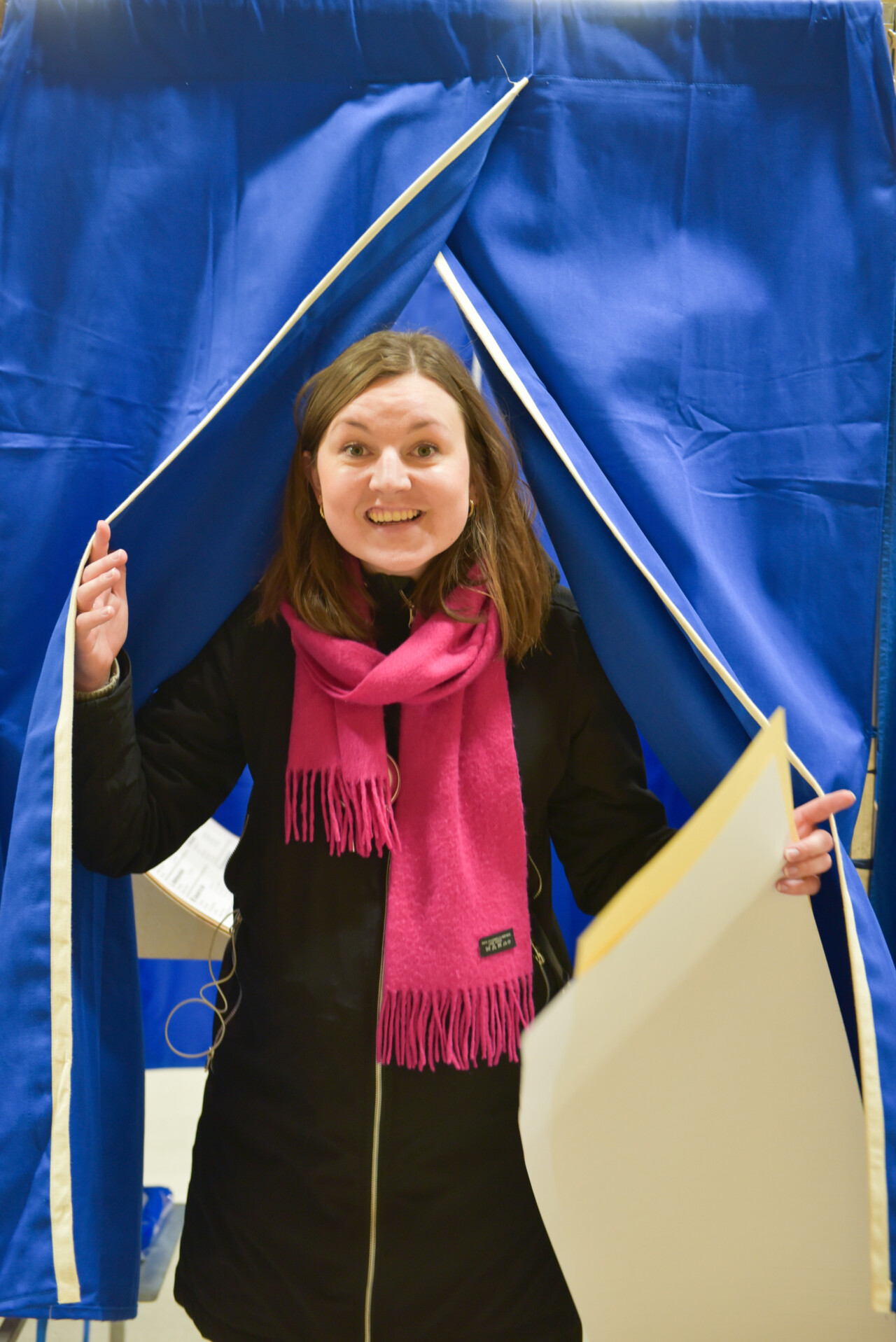 Der lugter af håndsprit og gummi i badmintonhallen, som er stadset op i stemmelokaleklæder. Katrine Kildgaard trækker det kongeblå forhæng i bag sig, og da hun kommer ud, har hun for første gang sat kryds ved sit eget navn.