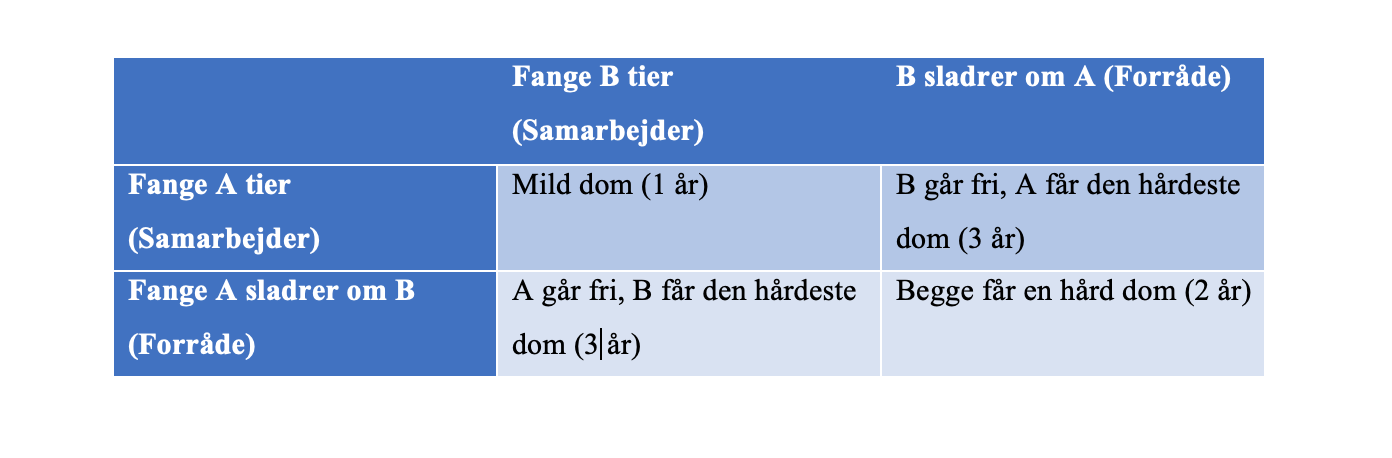 Dette er det værst tænkelige udfald målt i antal fængselsår, men fordi de begge antages at være egennyttemaksimerende aktører og derfor har svært ved at stole på hinanden, er valget uundgåeligt.