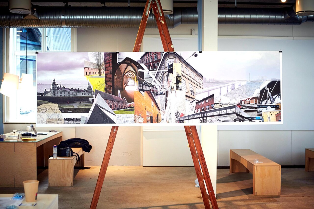 Til udstillingen i Helsingør har de studerende blandt andet skullet lave plancher. Den her hedder 'Helsingør, et sammensat landskab' og dækker over bymidten med udsigten til Helsingborg på den anden side Øresund - og at en bro kan blive en mulighed i fremtiden.