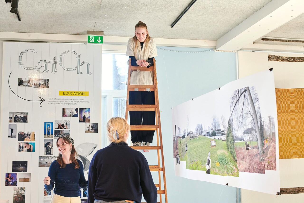 De studerende fra landskabsarkitektur er i gang med at sætte udstillingen op inden åbningen 28. april 2022.