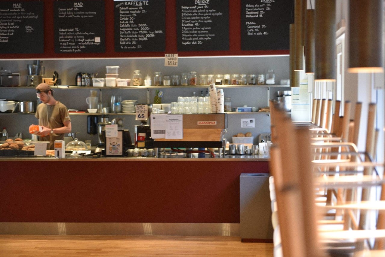 Normalt står to medarbejdere bag skranken, og når frokosten nærmer sig, og ansatte og studerende strømmer ud fra kontorer og undervisningslokaler for at få mad og drikke, kan de »virkelig få sved på panden«, siger Thomas Bruun Elsborg.